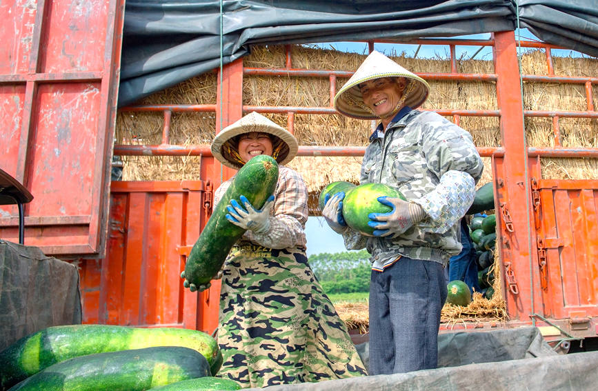时下,正值冬瓜丰收季,在广西北海市银海区福成镇沙虫江村,村民们正忙碌着抢收冬瓜上市。