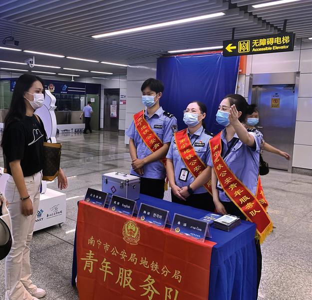 在市内重要交通枢纽,随处可见为市民服务的志愿者队伍。图为市公安局地铁分局青年服务队民警为问路市民指路。本报记者 覃雨轩 摄