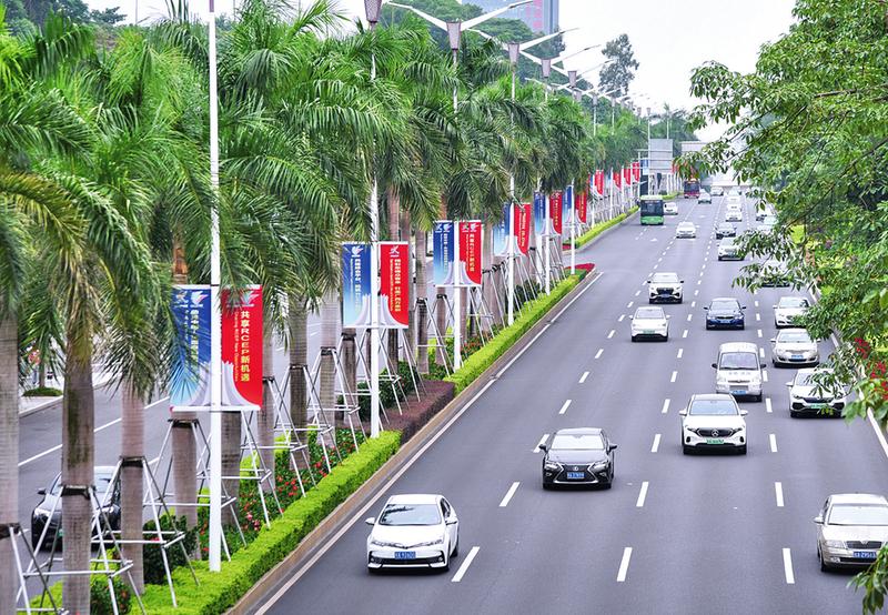 在民族大道凤岭立交路段,道路两侧挂上了喜迎盛会的POP旗。本报记者 黄红锦 摄