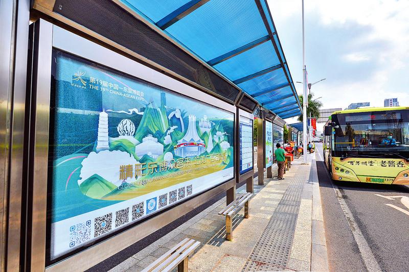 南宁市有近200座公交候车亭发布了喜迎第19届东博会和峰会的公益宣传。本报记者 黄维业 摄
