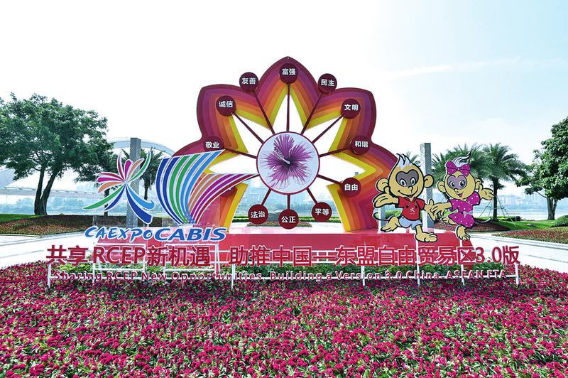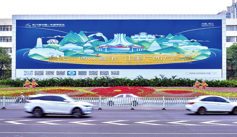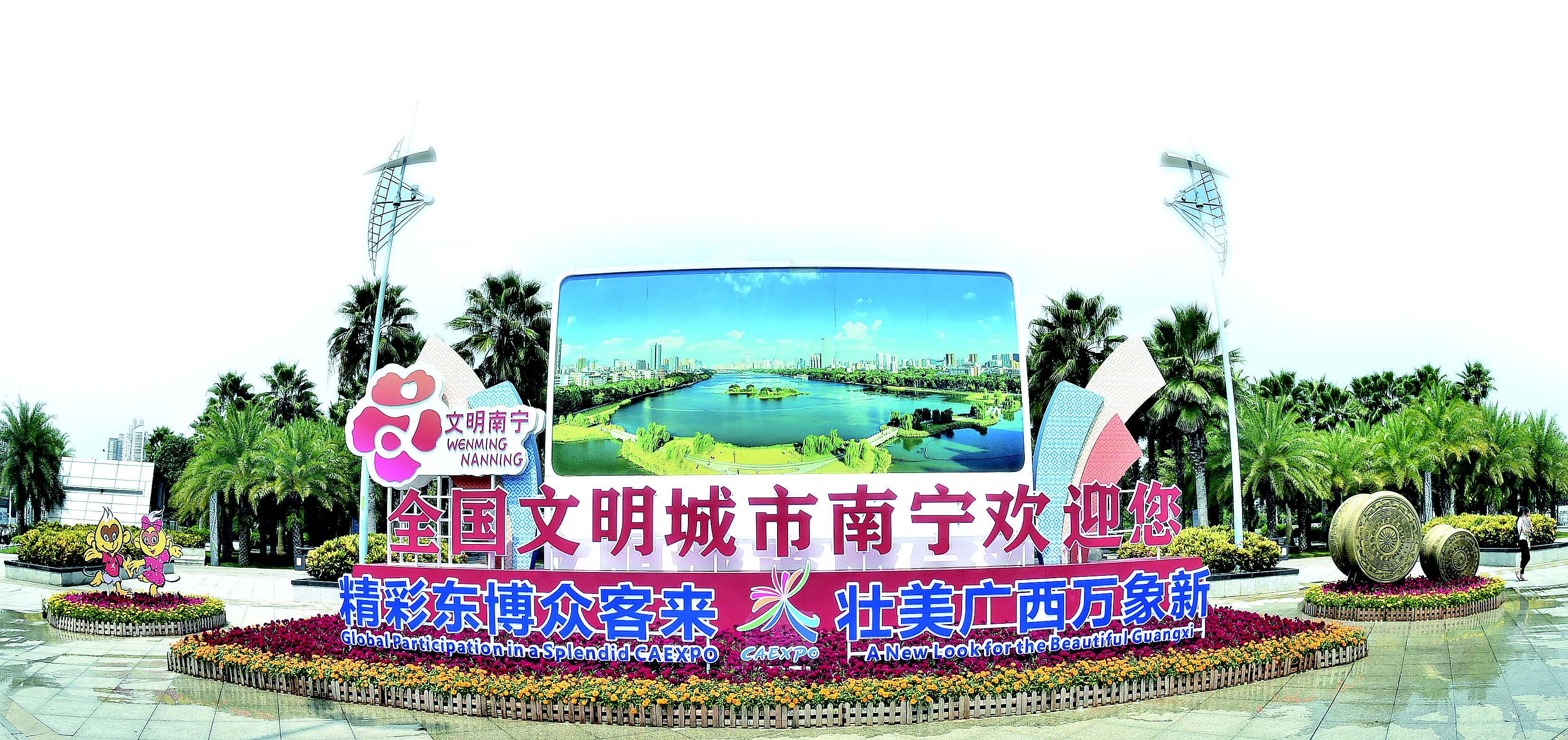 “共享RCEP新机遇,助推中国—东盟自由贸易区3.0版”“全国文明城市南宁欢迎您”“精彩东博众客来壮美广西万象新”……在南宁人民会堂前广场、民族广场、南湖公园、滨湖广场等地,随处可见东博会和峰会宣传画面,喜庆的东博会园林小品景观与盛开的鲜花交相辉映,等待盛会的到来。