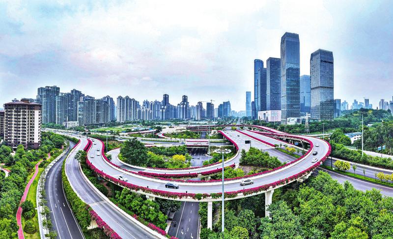 位于五象新区总部基地一带的平象立交上,怒放的三角梅喜迎八方宾客的到来。本报记者 叶子榕 摄