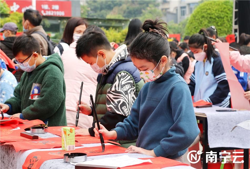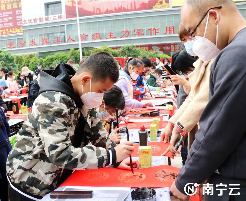 当天上午,文化宫职工广场上长桌排开,红纸铺就,广西的书法家们和南宁市少年儿童“书法成长课堂”的学生们同台挥毫泼墨,笔走龙蛇,将美好的祝愿融入到一幅幅春联、一张张大红“福”字中。闻讯而来的职工群众们簇拥在大小书法家们身边,看着自己选中的春联内容一笔一划地写出,喜悦之情溢于言表。红红的春联高高晾晒,浓浓的墨香四散飘溢,整个职工广场一片欢声笑语,一派喜庆热闹,洋溢着浓浓的年味。