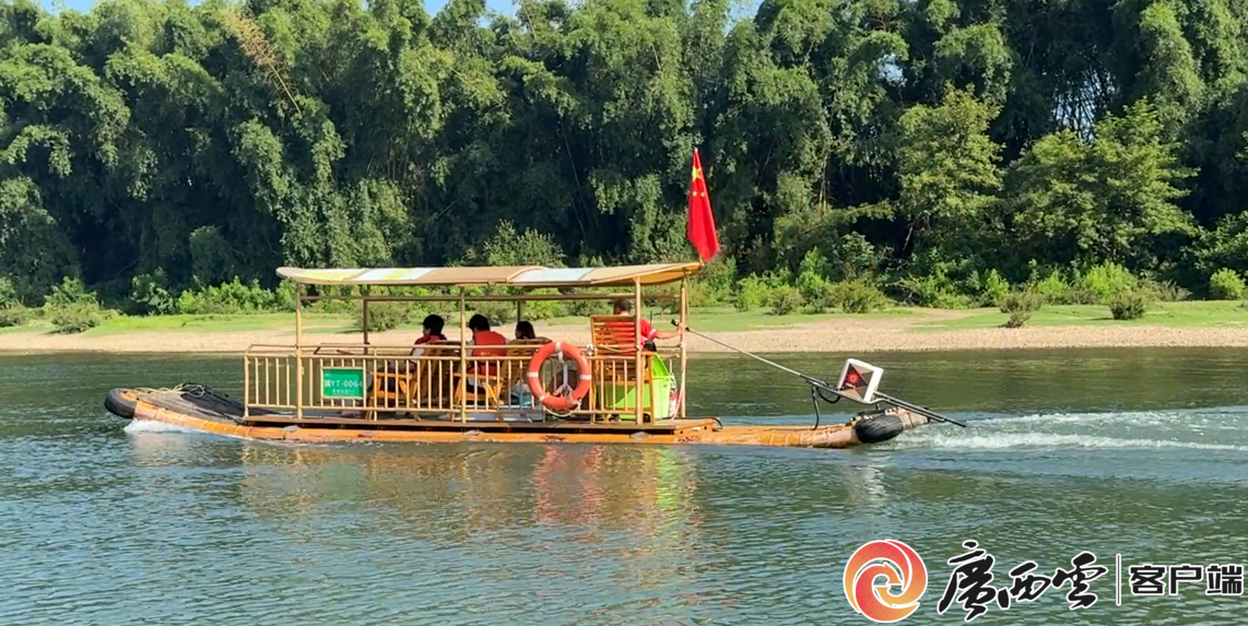 游客乘坐电动竹筏观赏漓江景色。陈钦荣 摄