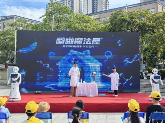 步入现场体验区,一场精彩纷呈的科普之旅就此展开。南宁市科技馆带来的实验科普剧、机器人以及机器狗现场秀率先吸引了众人目光,机器人和机器狗在场地中穿梭展示,人工智能更是凭借着“卖萌”的姿态,将语音交互、科普讲解等技能一一呈现,让人不禁感叹科技的奇妙与趣味;威盛未来科学馆精心打造的“未来实验室”别具一格,市民们只要戴上VR头显,便能身临其境地体验芯片微纳制造、脑控交互等前沿科技,瞬间穿越到了充满科技感的未来世界。