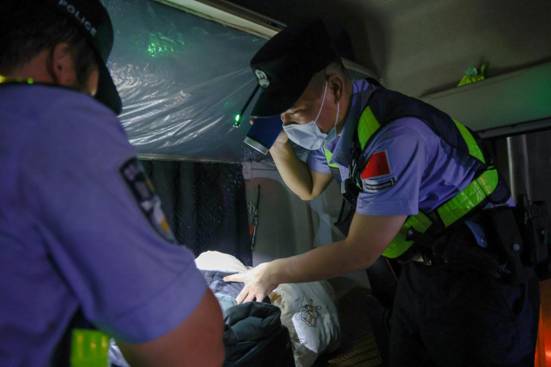 图为爱店边检站民警对车体开展检查。(苏畅 摄)