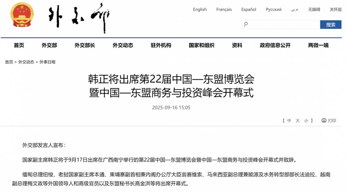 韩正将出席第22届中国—东盟博览会暨中国—东盟商务与投资峰会开幕式