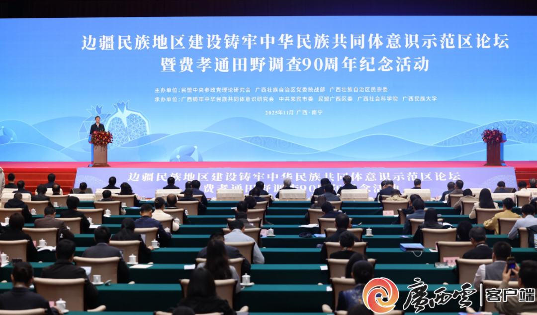 11月4日,边疆民族地区建设铸牢中华民族共同体意识示范区论坛暨费孝通田野调查90周年纪念活动在南宁举行,深入学习贯彻党的二十届四中全会精神和习近平总书记关于加强和改进民族工作的重要思想,共谋边疆民族地区发展,铸牢中华民族共同体意识,共同纪念和传承费孝通先生学术思想和高尚风范。全国人大常委会副委员长、民盟中央主席丁仲礼,自治区党委书记、自治区人大常委会主任陈刚出席并致辞。